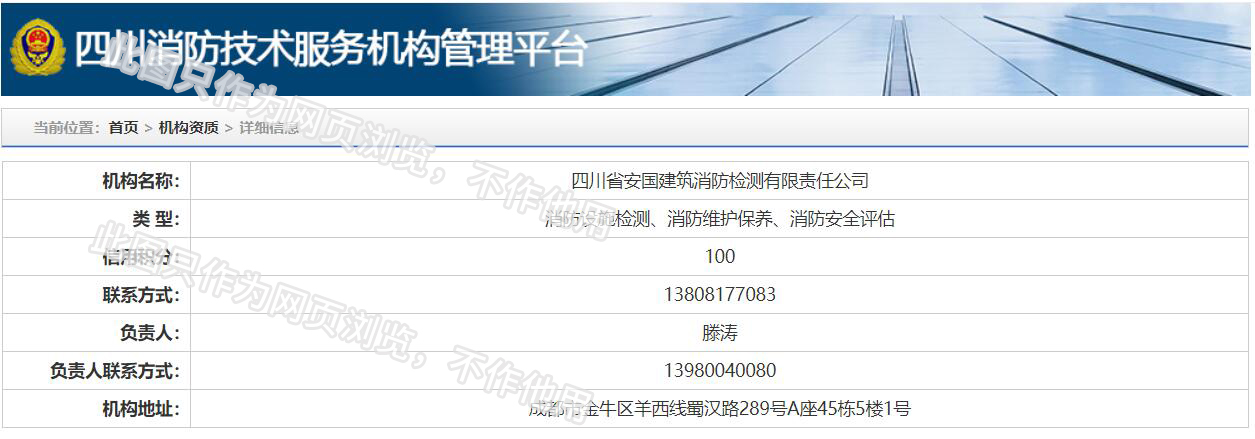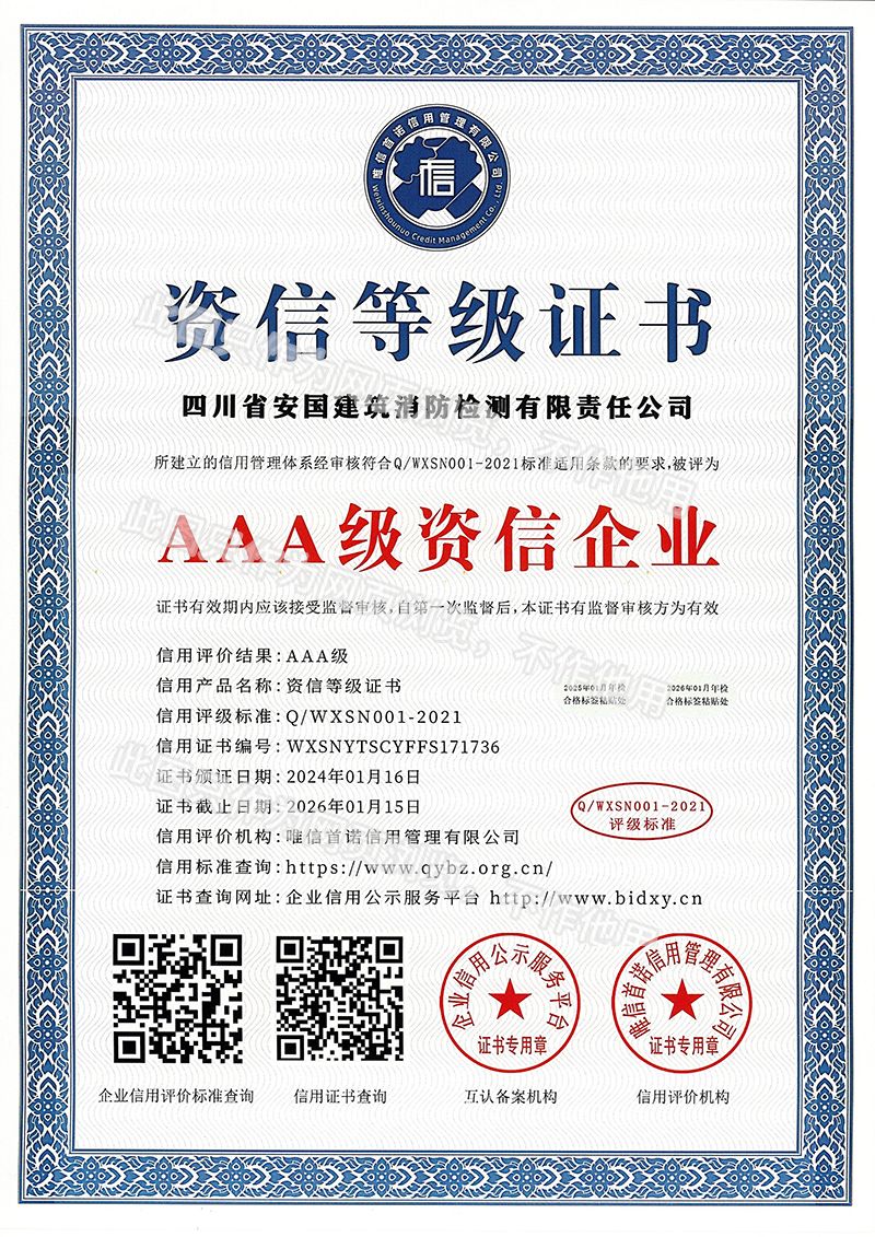 四川省安國建筑消防檢測有限責任公司,成立于1998年,經(jīng)四川省公安消防總隊批準,工商部門注冊的獨立法人單位。 公司具有建筑消防設施檢測、電氣防火安全檢測、維修、保養(yǎng)及技術咨詢一級資質的中介技術服務機構,獲得CMA計量認證。主要業(yè)務范圍是:接受建設單位或有關單位委托,承擔新建、改建、擴建建筑自動消防設施技術檢測、電氣防火安全檢測、以及承接建筑消防設施維護保養(yǎng),對已交付使用的建設消防設施的運行情況進行運行檢測,開展建筑消防設施的消防安全技術咨詢。公司設辦公室、總工辦、財務部、檢測部、維保部等職能機構,擁有一
